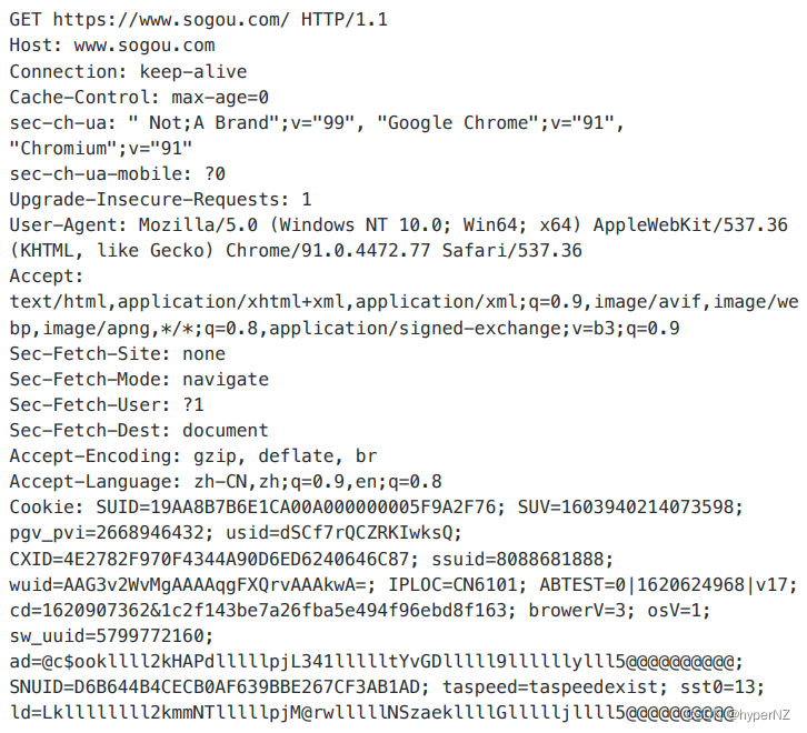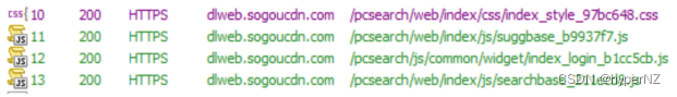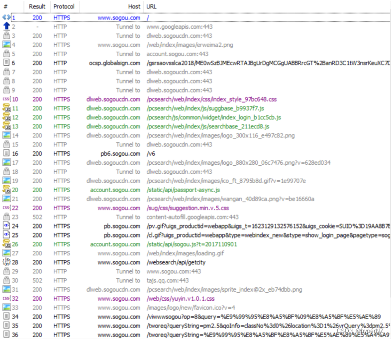 抓包抓到的⼤部分结果都是 200。例如访问搜狗主⻚: