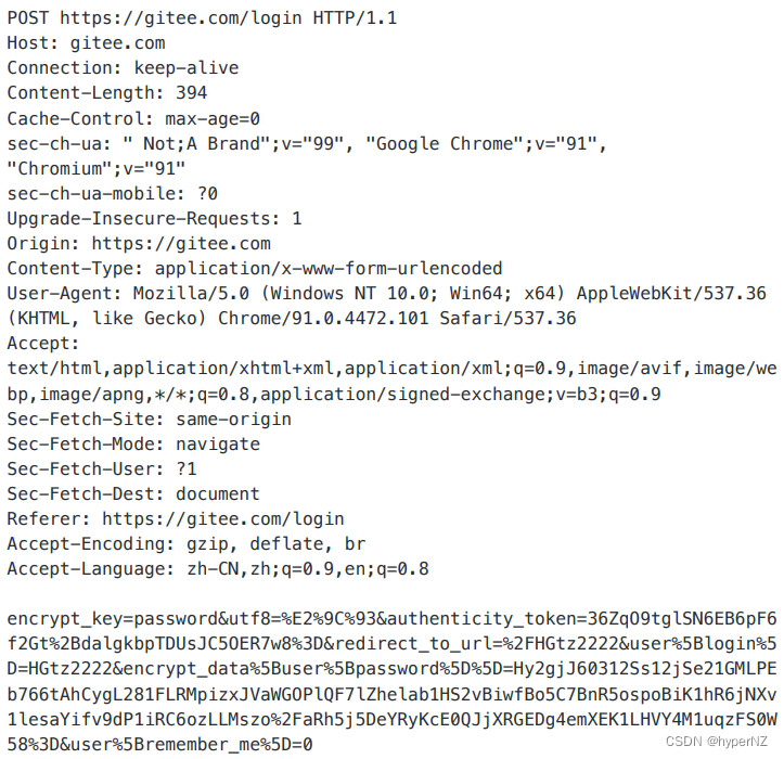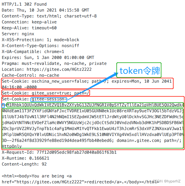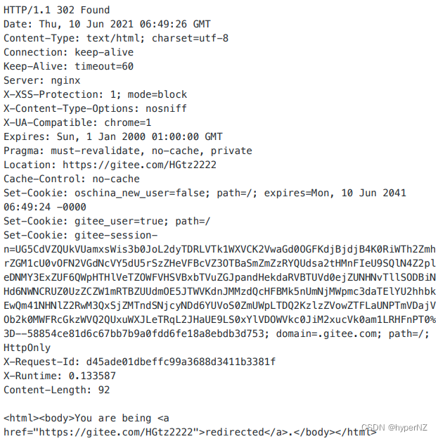 例如:码云的登陆⻚⾯ https://gitee.com/login ,抓包看到的响应结果:可以看到 header 中的 Location: https://gitee.com/HGtz2222 ,接下来浏览器就会⾃动发送 GET 请求,获取 https://gitee.com/HGtz2222。
