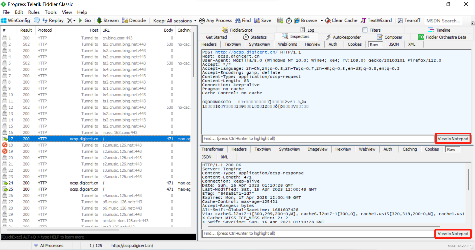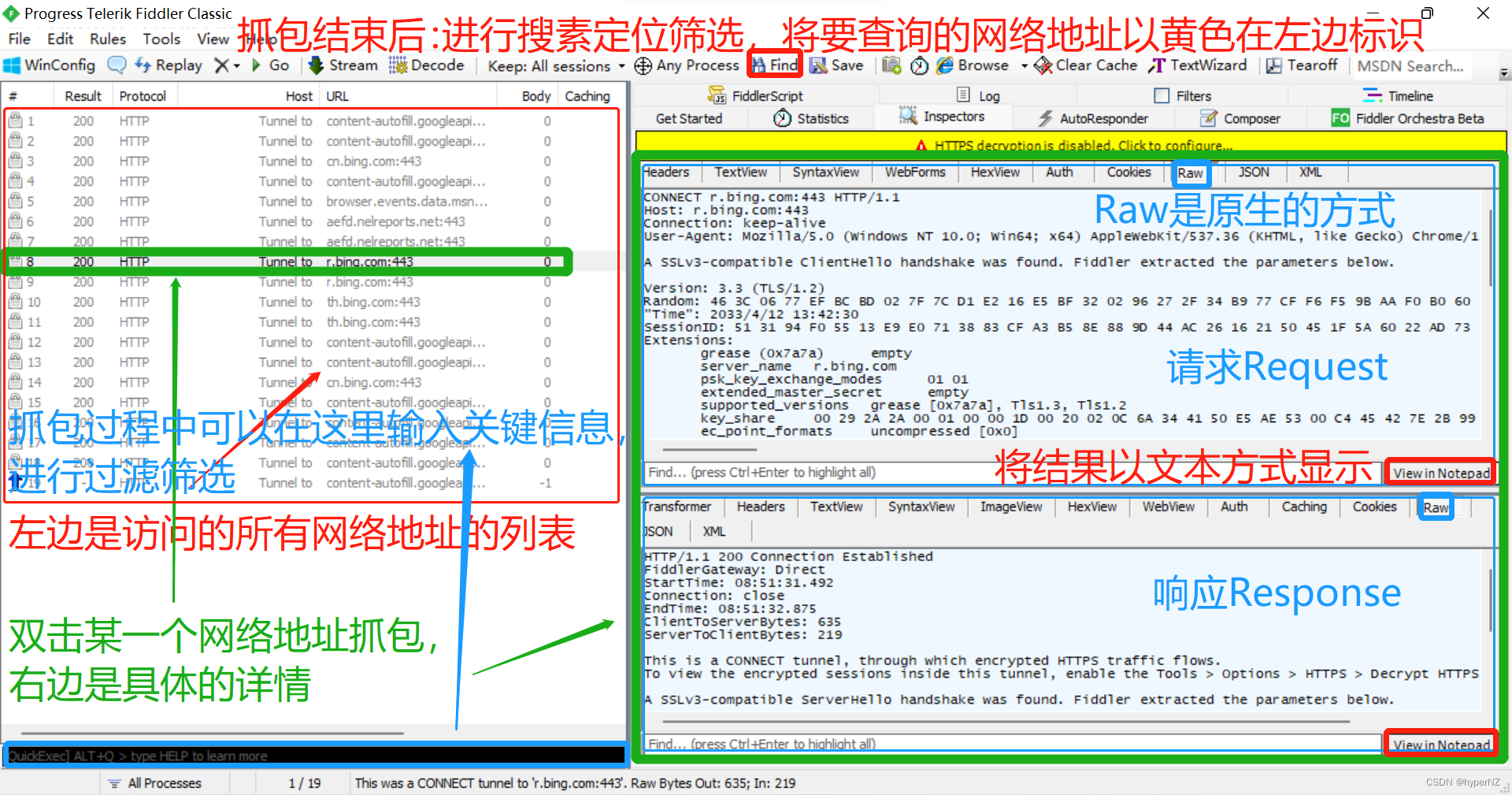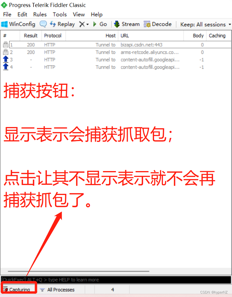 ③在Fiddler中观察抓包结果。并且可以点击左下角Capturing按钮,让其停止抓包,方便做信息筛选。