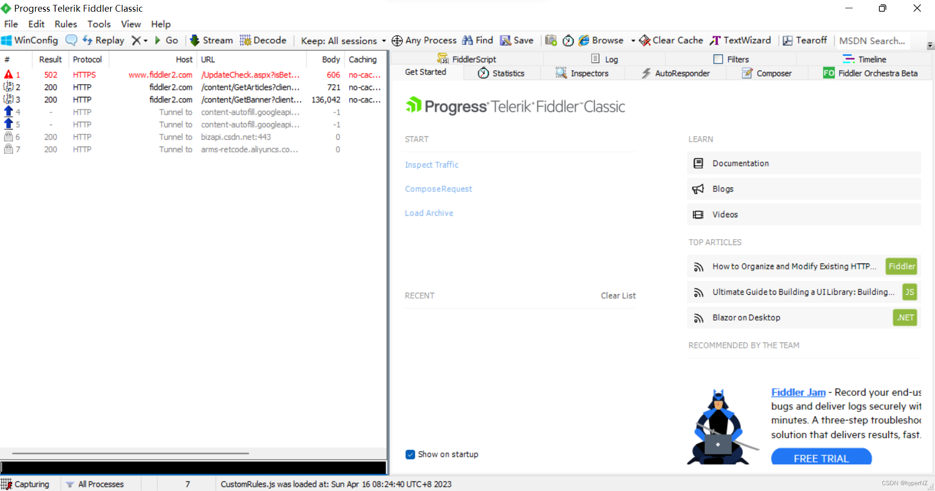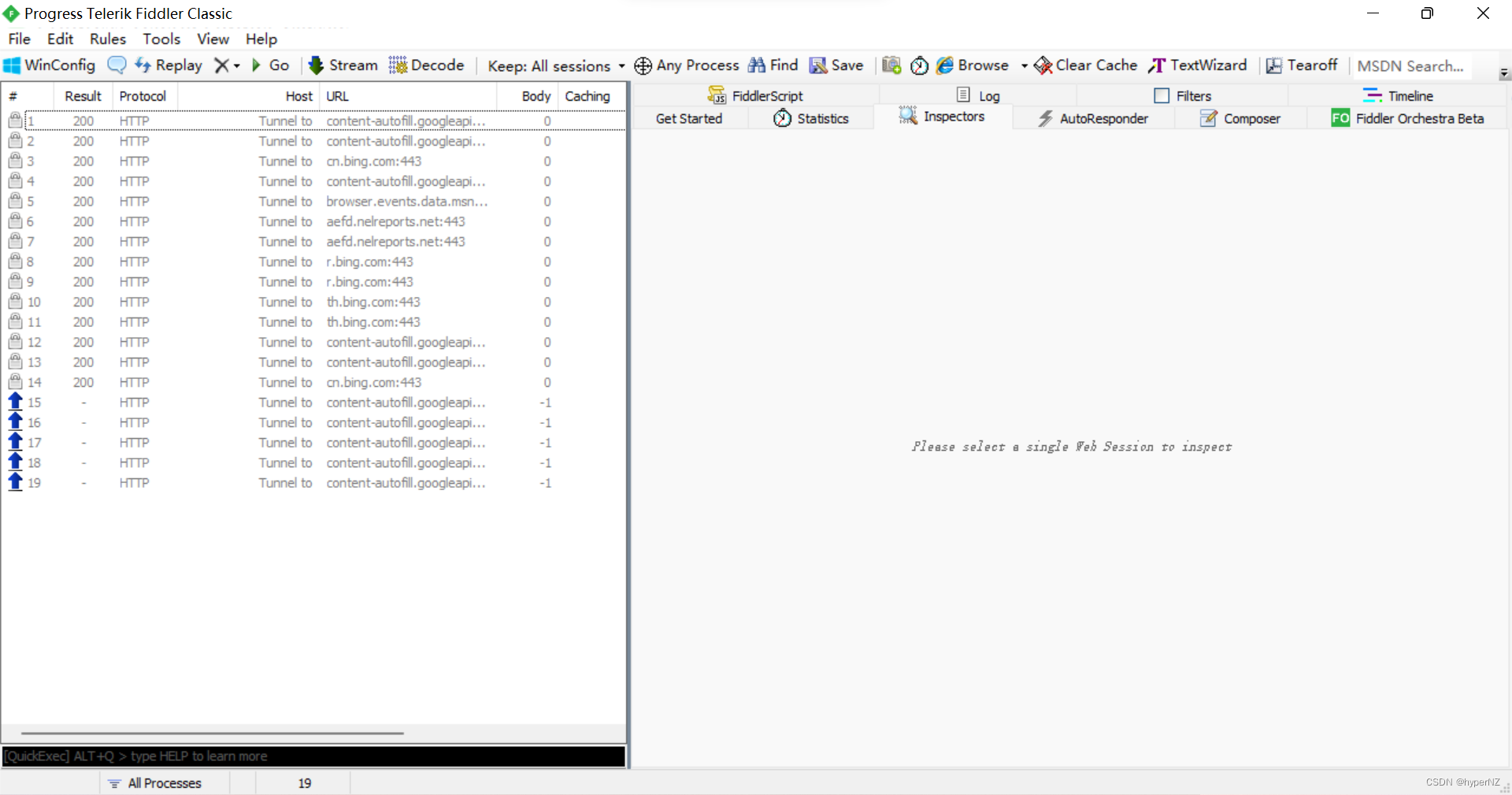 当打开Fiddler之后,它就会直接抓取电脑上的一些包,只要有网络请求,Fiddler都会进行拦截和抓取。