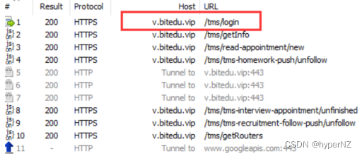 - 左侧窗⼝显示了所有的 HTTP请求/响应,可以选中某个请求查看详情。