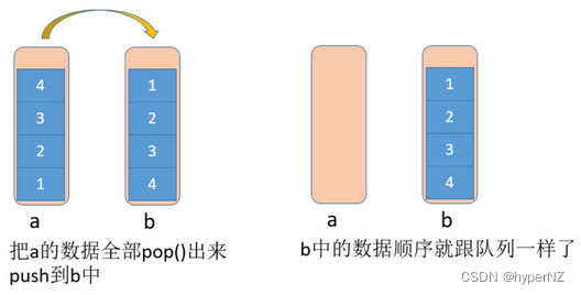 栈是后进先出,队列是先进先出,想要用栈实现队列,需要把a栈中的元素挨个pop()出来,再push到b栈中。经过这么一番操作后,b栈中的元素顺序就变成先进先出的顺序了,所以b栈中的顺序跟队列顺序一样了。