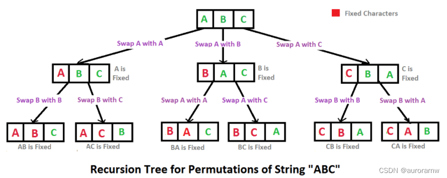 使用临时变量去组装一个排列的情况:每当我们选取一个字符以后,就确定了其位置,相当于对字符串中剩下的元素进行全排列添加在该元素后面,给剩余部分进行全排列就是一个子问题,因此可以使用递归。