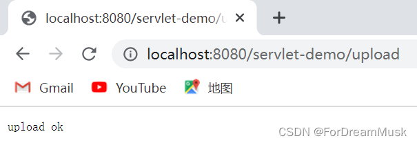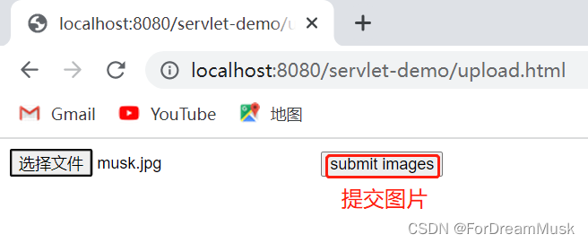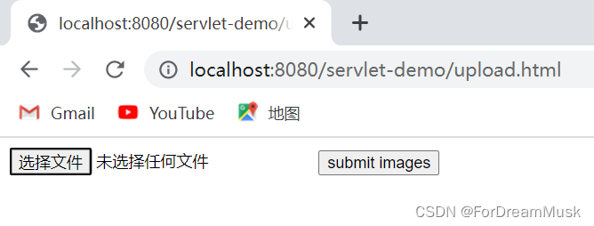 - 部署程序,在浏览器中通过 URL(http://localhost:8080/servlet-demo/upload.html 访问)