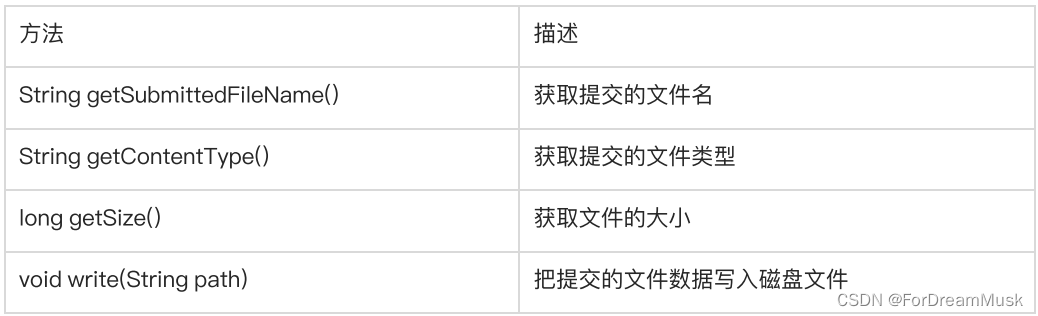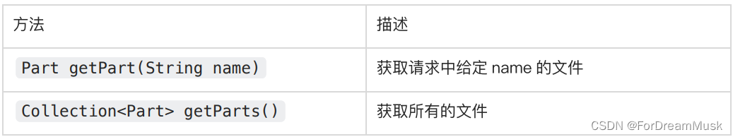 - 客户端⼀次可以提交多个⽂件,(使⽤多个 input 标签),此时服务器可以通过 getParts 获取所有 的 Part 对象。