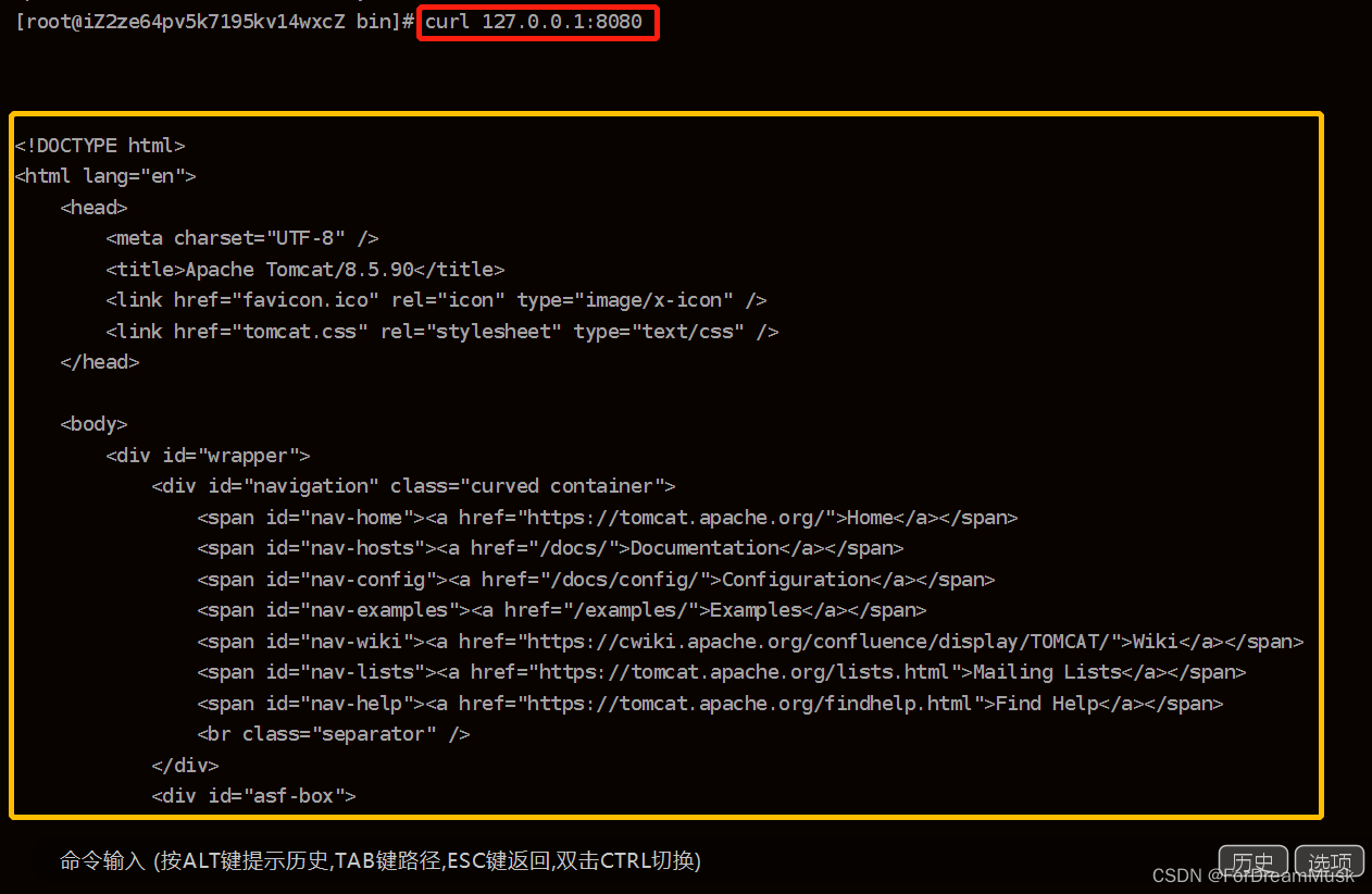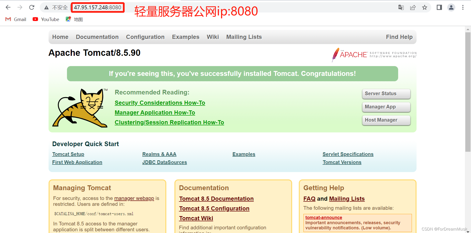 打开浏览器,在地址栏中输⼊ECS公⽹IP,例如:47.95.157.248,如果显示如下界⾯,则表示Tomcat安装配置成功。