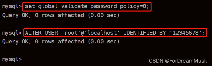 set global validate_password_policy=0; #修改密码安全策略为低(只校验密码⻓度,⾄少8位)。