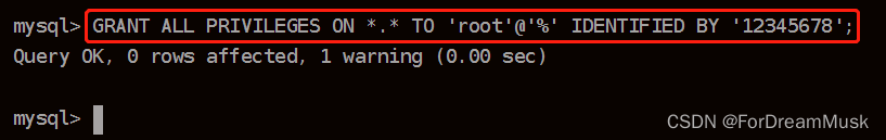 GRANT ALL PRIVILEGES ON *.* TO 'root'@'%' IDENTIFIED BY '12345678';