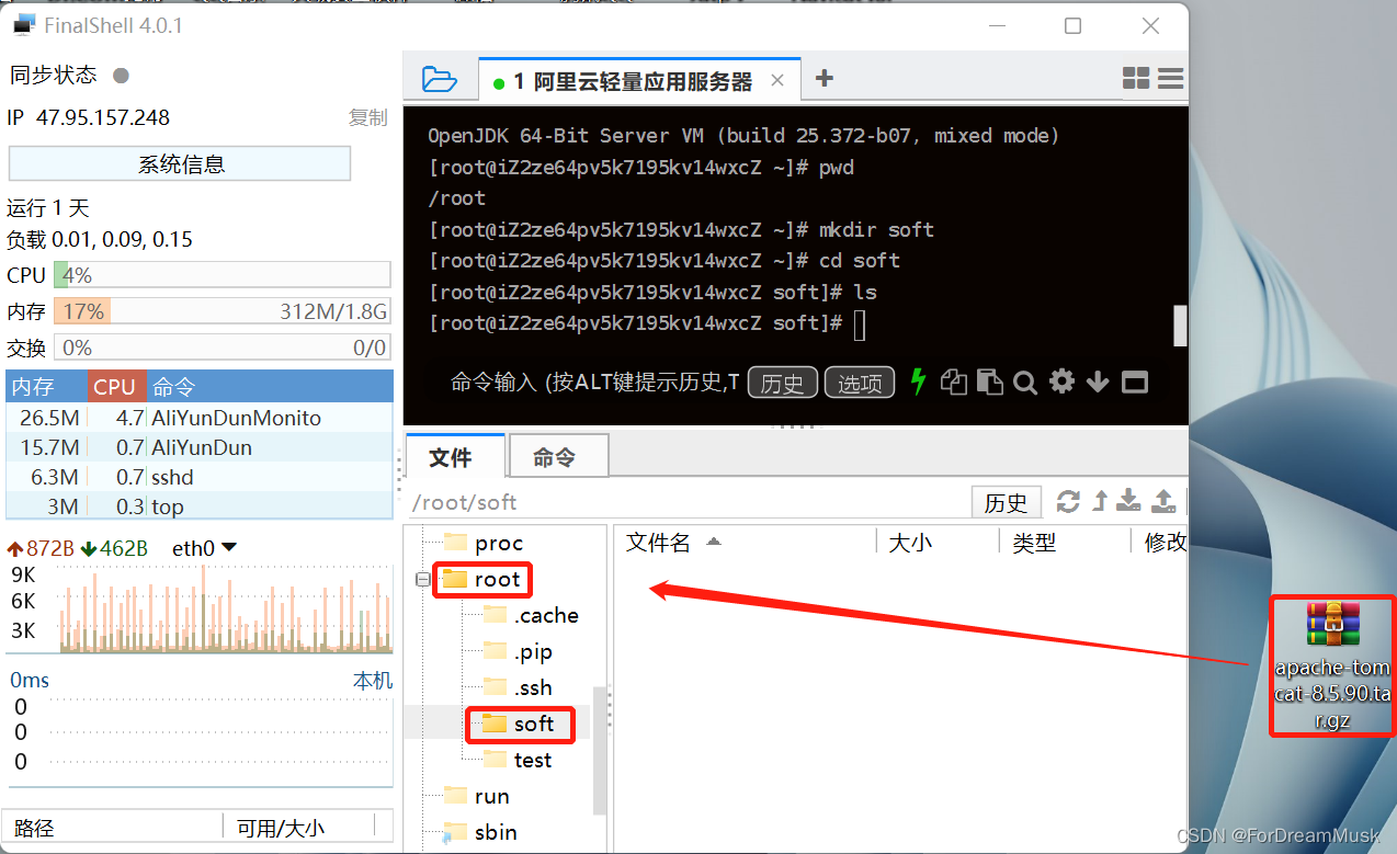 ①去官网下载Tomcat压缩包至本地,再拖拽至FinalShell中,将其上传至Linux服务器。