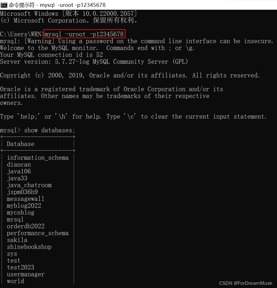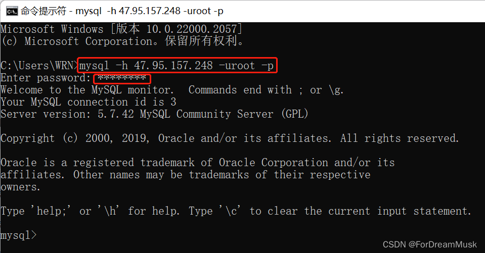 此时通过本地的cmd命令提示符窗口,就可以直接连接远程服务器的mysql了: