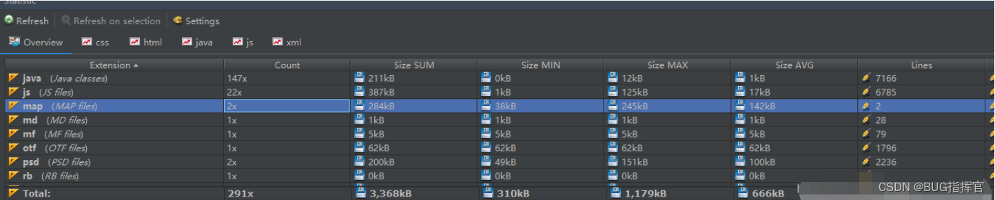 统计插件,查看你的代码数据。比如整个项目的代码总行数,分别统计各个类型文件的总行数。
