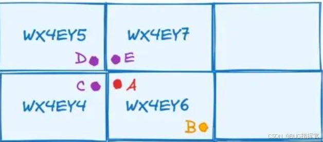 用geohash那结果显然是AB更近,但是实际上A与B的距离比AE、AC、AD都远。这其实是一个边缘性的问题。