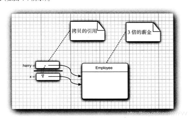 在调用add方法后,员工的工资得到了提高。因为x被初始化为harry值得拷贝,这是一个对象的引用。raiseSalary方法应用于对象的引用。x和harry同时引用的Employee对象的工资提高了。方法结束后,x便不再被使用,但是harry继续引用那个工资被提高的Employee对象。