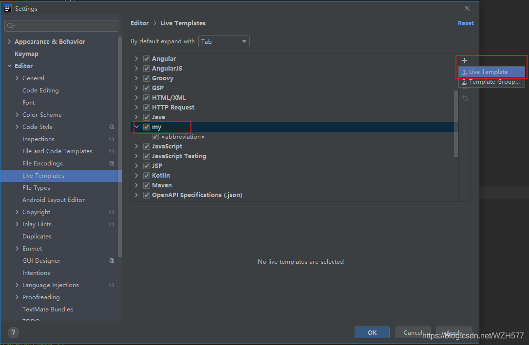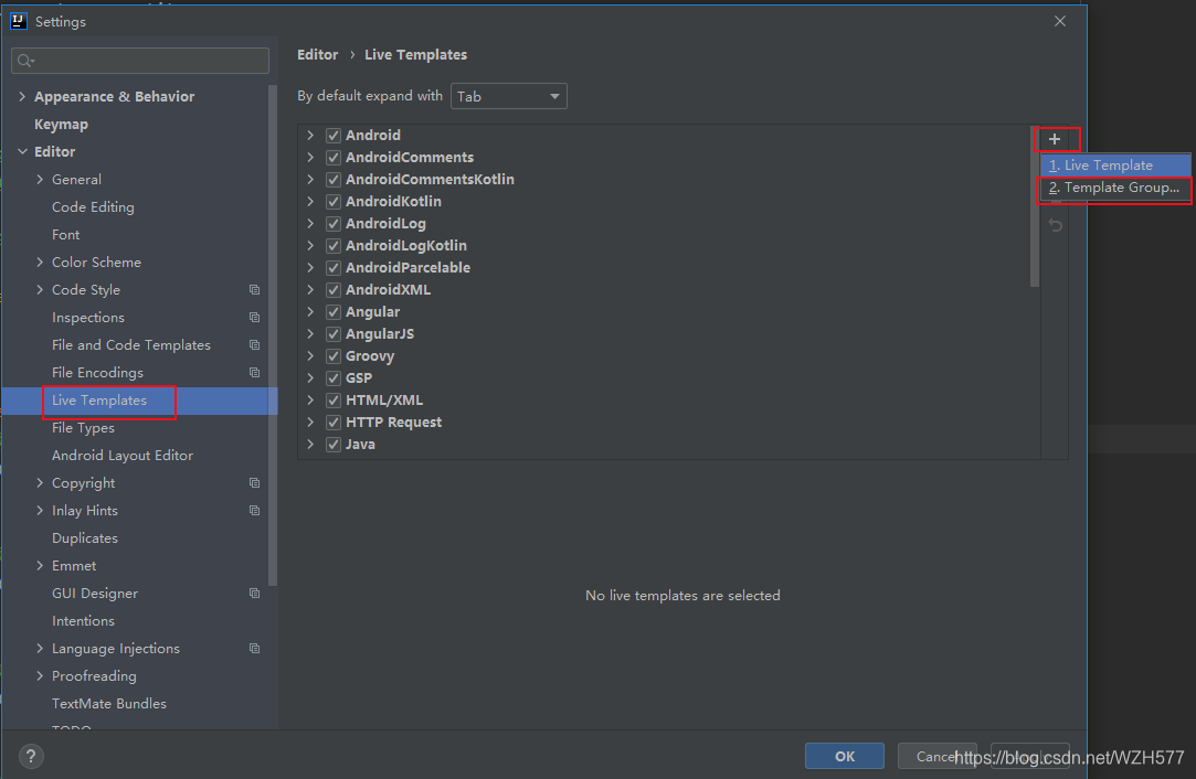 File-->Setting-->Editor-->Live Templates-->添加组
