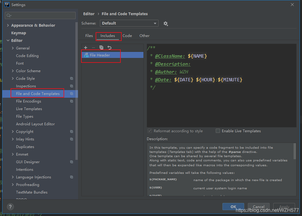 File-->Setting-->Editor-->File and Code Templates-->Includes-->File Header