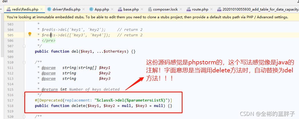 这里触及到知识盲区了,怎么你phpstorm作为一个IDE,你还要操作我的代码逻辑?考虑得这么细致,在当前环境redis的版本已经不支持delete方法时,会自动帮我转化为del方法!
