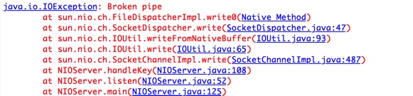 Broken pipe了 ,根据tcp的约定,当收到reset包的时候,上层必须要做出处理,调用将socket文件描述符进行关闭,其实也意味着pipe会关闭,因此会抛出这个顾名思义的异常。