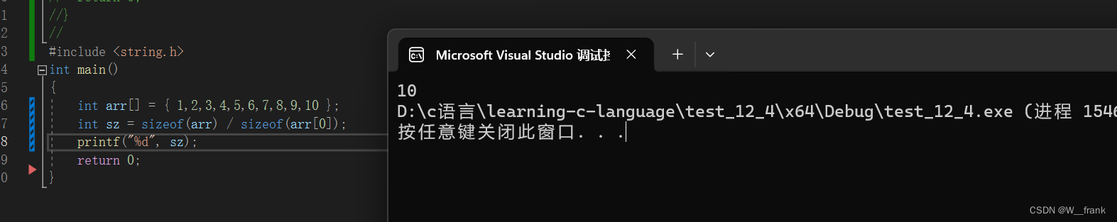 - 对于其他的数组呢,比如数字的,我们就用sizeof 函数计算,sz(长度)= sizeof(数组名) / sizeof(数组首个元素)