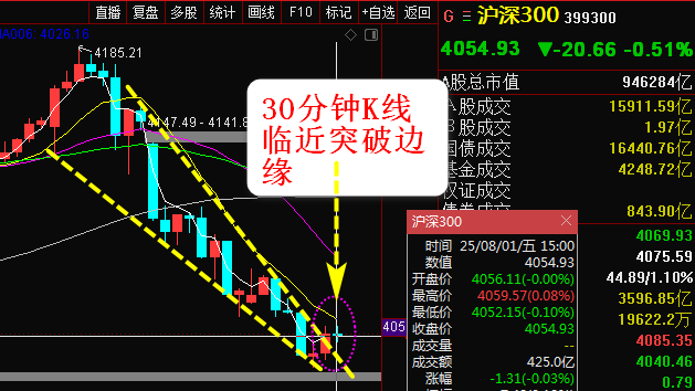 今天该指数30分钟级别角度,已经突破下降轨道线;结合量化择时模式的共振,下周一(0804)有望收阳线概率大!