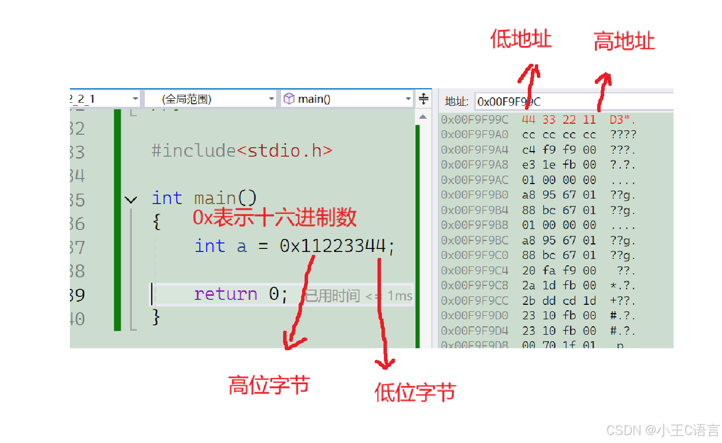 ⼩端(存储)模式:是指数据的低位字节内容保存在内存的低地址处,⽽数据的⾼位字节内容,保存 在内存的⾼地址处。