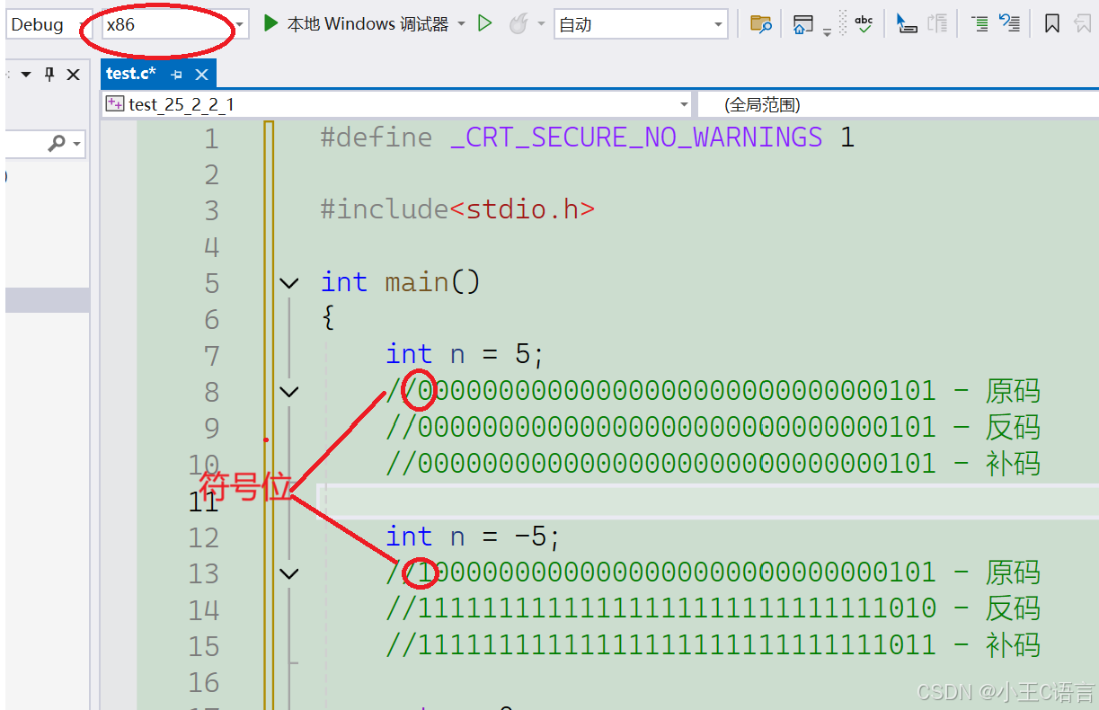 例:在x86(32位)环境下,5和-5在内存中的原码、反码和补码