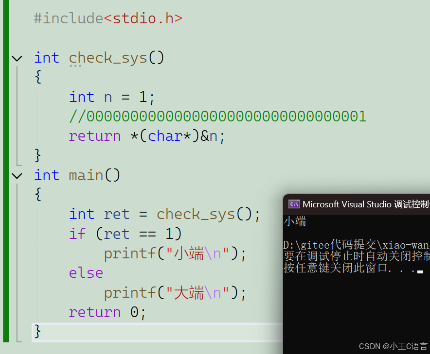 如果是小端:n的低地址存的是最低位字节00000001(值为 1),所以ret=1,输出 “小端”。