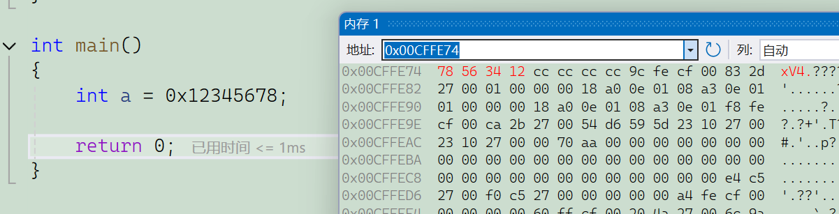 如果我们想知道当前编译器是大端还是小端的时候可以进行内存监视或者写段代码来进行判断: