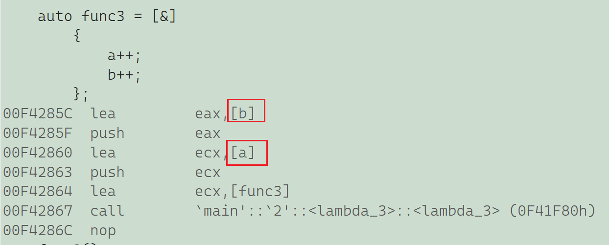 - [&]:按引用捕获所有外部变量(lambda 体内使用的变量),隐式引⽤捕捉,⽤了哪些变量就捕捉哪些变量