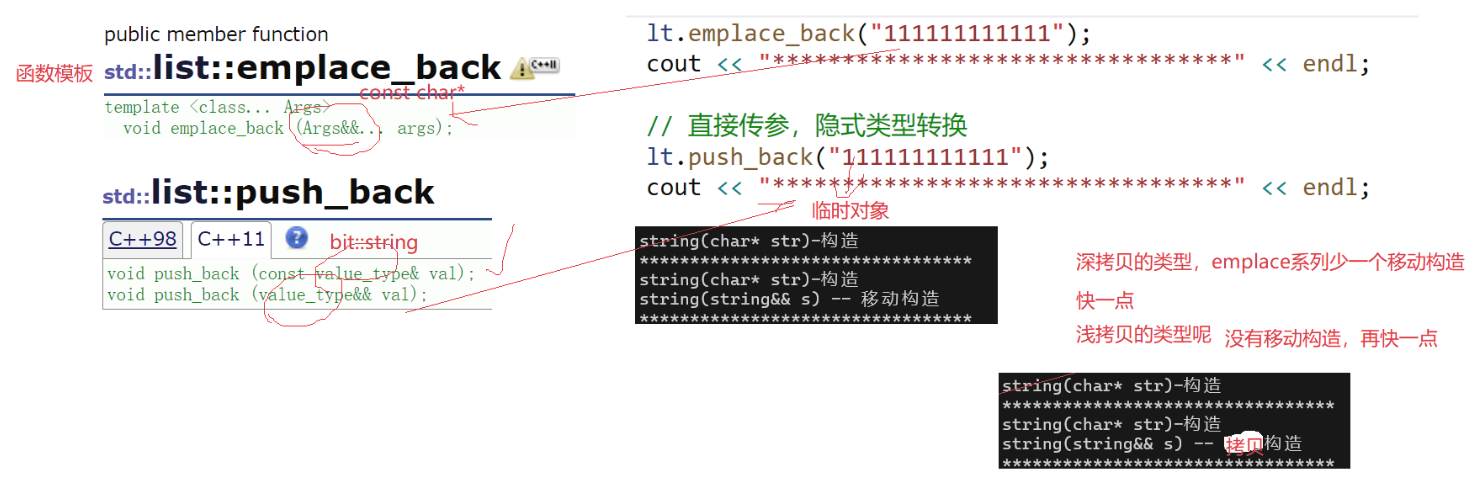 - emplace_back("111111111"):直接将参数传递给list内部的string构造函数,在容器内存中直接构造对象,仅 1 次构造。