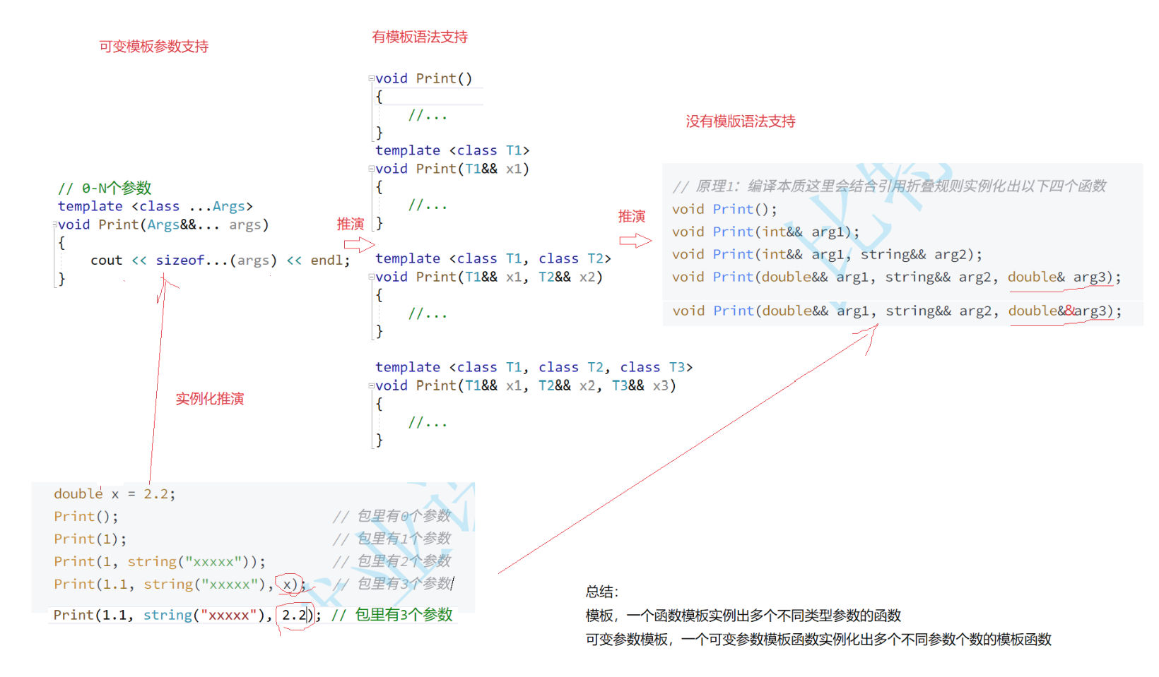 - 可变参数模板函数的参数个数和类型均可变,实例化出不同参数个数、且类型可能不同的函数。