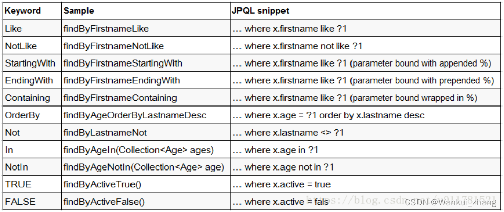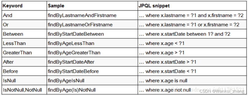 3、 涉及条件查询时,条件的属性用条件关键字连接