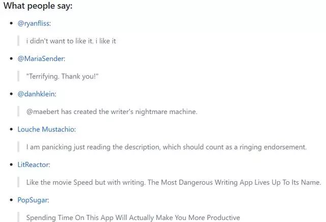 感受一下大家的评价吧:"丧心病狂","写作者的噩梦源泉","这才是真正的生产力工具!"刚开始在这个网页上码字时,我慌的不行,时刻都在担心到5秒了,被删稿子。不过使用15分钟后,我居然非常习惯了,而且码字速度也快了~