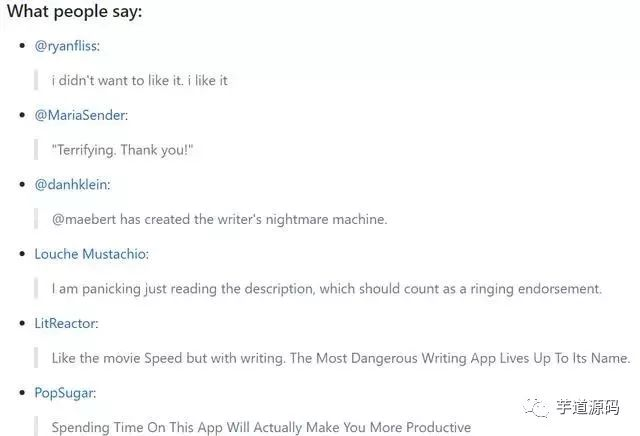 感受一下大家的评价吧:"丧心病狂","写作者的噩梦源泉","这才是真正的生产力工具!"刚开始在这个网页上码字时,我慌的不行,时刻都在担心到5秒了,被删稿子。不过使用15分钟后,我居然非常习惯了,而且码字速度也快了~
