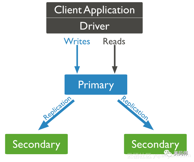 副本集又是另一个话题,实质上除了前面架构图所体现的,副本集可以作为 Shard Cluster 中的一个Shard(片)之外,对于规模较小的业务来说,也可以使用一个单副本集的方式进行部署。MongoDB 的副本集采取了一主多从的结构,即一个 Primary Node + N* Secondary Node的方式,数据从主节点写入,并复制到多个备节点。