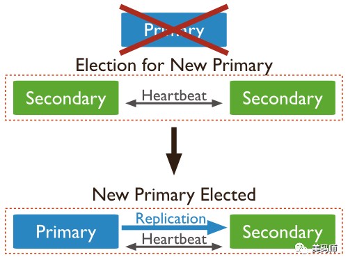 在高可用的实现机制中,心跳(heartbeat)是非常关键的,判断一个节点是否宕机就取决于这个节点的心跳是否还是正常的。副本集中的每个节点上都会定时向其他节点发送心跳,以此来感知其他节点的变化,比如是否失效、或者角色发生了变化。利用心跳,MongoDB 副本集实现了自动故障转移的功能,如下图: