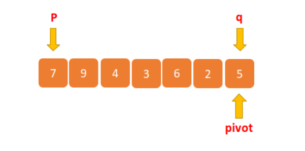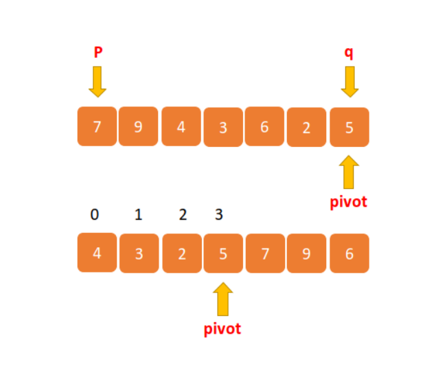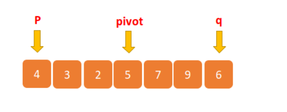 如上数据,我们从 p 到 q 随机找一个元素作为区分点(pivot),什么是区分点?稍后我们解释。我们就选择最后一个数据 5 吧,然后我们以 5 为区分点,然后从 p 开始遍历元素,如果当前遍历的元素小于 5,我们就放在 5 的前边,如果当前遍历的元素大于 5,我们就放在 5 的后边,最后的结果如下: