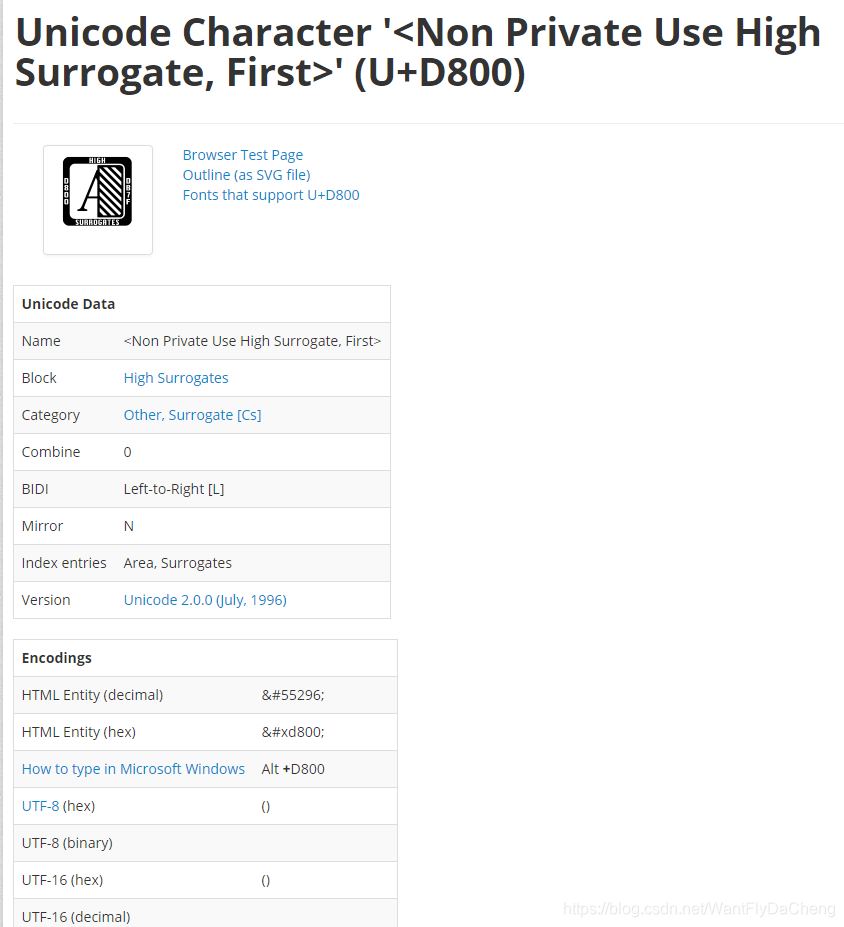 你看这个它就没有任何的码点表示,而是提示这个“Non Private Use High Surrogate, First”,Surrogate翻译过来是代理的意思,这个码点对应的是代理区了,这个就涉及到unicode的三种编码方式了(换句话就是码点如何转换为utf-8或者utf-16或者utf-32),utf-16中用到了代理区这个概念。
