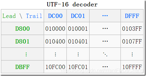 一个高代理区(即上图中的Lead(头),行)的加一个低代理区(即上图中的Trail(尾),列)的编码组成一对即是一个代理对(Surrogate Pair),必须是这种先高后低的顺序,如果出现两个高,两个低,或者先低后高,都是非法的。