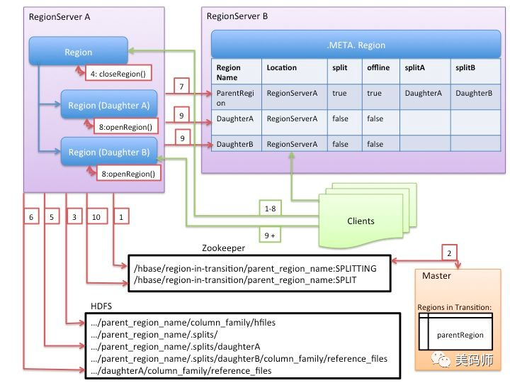 RegionServer 在.split文件夹下新建两个子Region的目录,同时分别生成拆分后的reference文件(仅仅是引用信息);