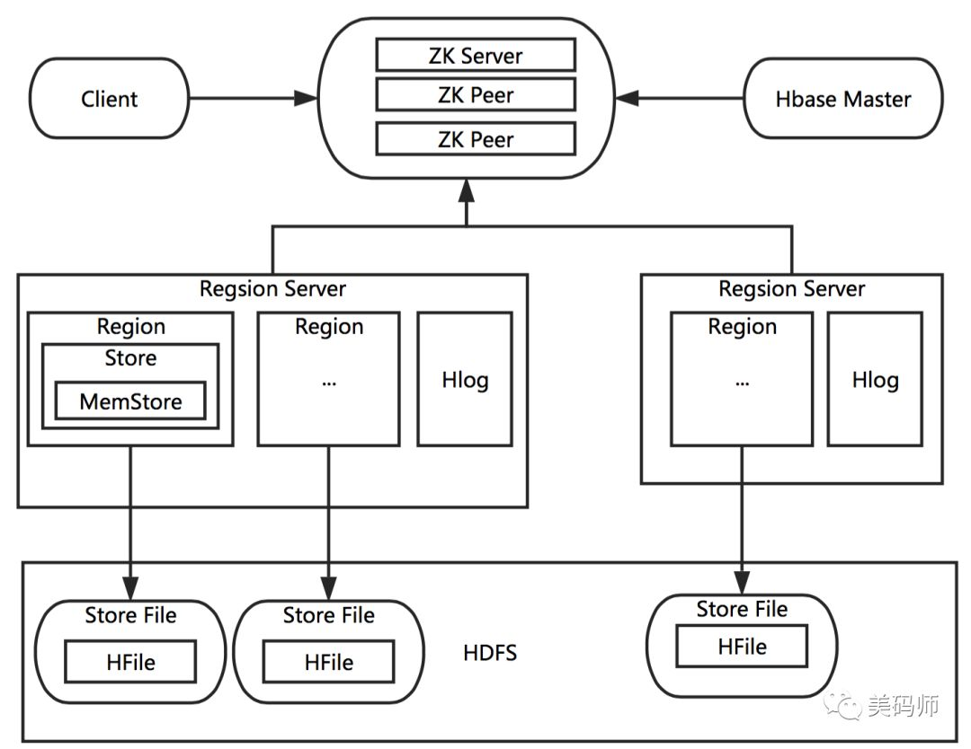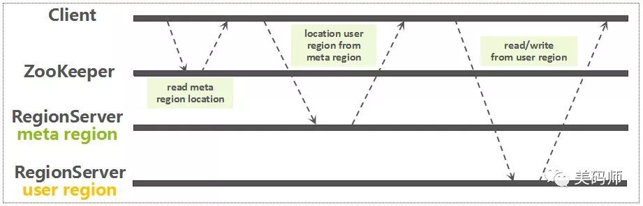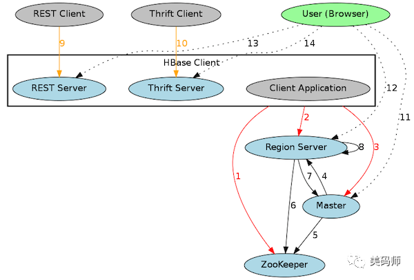 在一个完整的HBase 分布式集群中,各个组件的交互工作如下图所示: