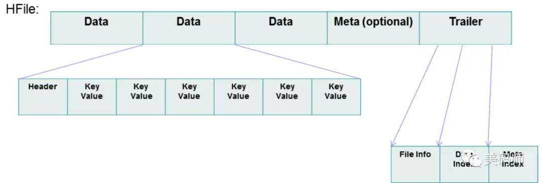 HFile 由很多个数据块(Block)组成,并且有一个固定的结尾块。其中的数据块是由一个 Header 和多个 Key-Value 的键值对组成。在结尾的数据块中包含了数据相关的索引信息,系统也是通过结尾的索引信息找到 HFile 中的数据。
