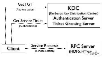 Kerberos 是一个常见的身份认证及鉴权协议系统,使用 Kerberos 的系统在设计上采用C/S结构及AES对称加密技术,并且能够进行双方认证。支持防止窃听、防止replay攻击、保护数据完整性等特性。 Kerberos 认证过程需要依赖于单独的 Kerberos Server(KDC),一个认证过程如下图: