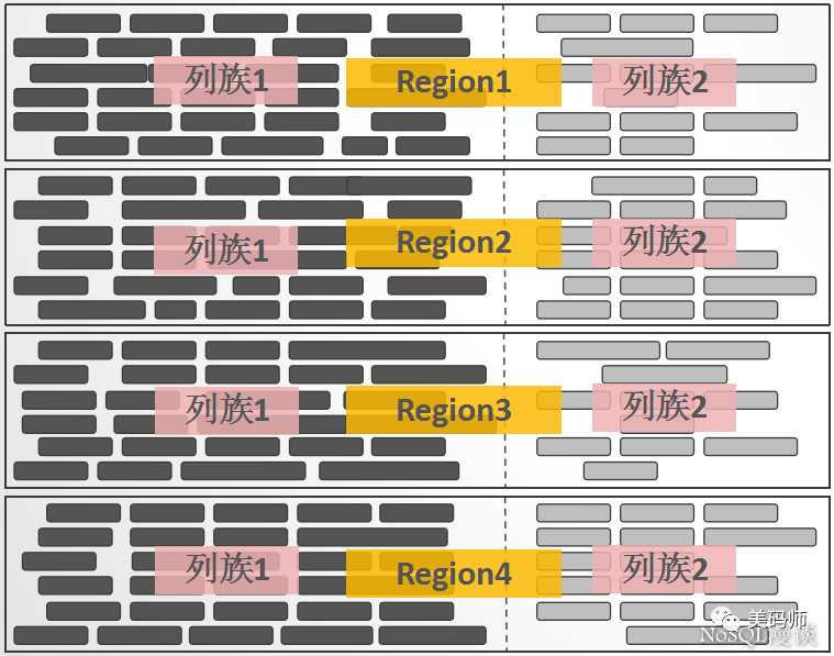 Region 是HBase 分布式存储的基本单位,其本质上是一种水平切分单位,可以理解为数据的分片;而Column Family(列族)则是垂直切分的单位,可理解为一种列的分组。这两者的区别可以参考下图: