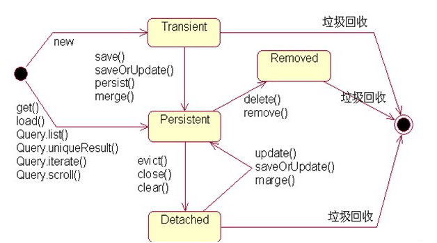 最新的Hibernate文档中为Hibernate对象定义了四种状态(原来是三种状态,面试的时候基本上问的也是三种状态),分别是:瞬时态(new, or transient)、持久态(managed, or persistent)、游离态(detached)和移除态(removed,以前Hibernate文档中定义的三种状态中没有移除态),如下图所示,就以前的Hibernate文档中移除态被视为是瞬时态。