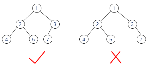 首先解释下什么是完全二叉树,设一颗二叉树的深度为h,除第 h 层外,其它各层 (1~h-1) 的结点数都达到最大个数,第 h 层所有的结点都连续集中在最左边,这就是完全二叉树。如下图所示,左侧的二叉树满足完全二叉树的定义,而右侧的不满足。