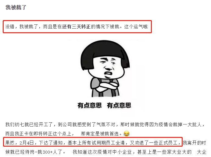 2月5日,公号秦子帅发表名为一篇《疫情下,我被裁了》,让技术圈一阵唏嘘。主人公从事Android开发,在还没正式上班(2.10)前,就通知被cai了。主人公表示:2月4日,公司下达了通知,基本上所有试用期员工全清,又劝退了一些正式员工。
