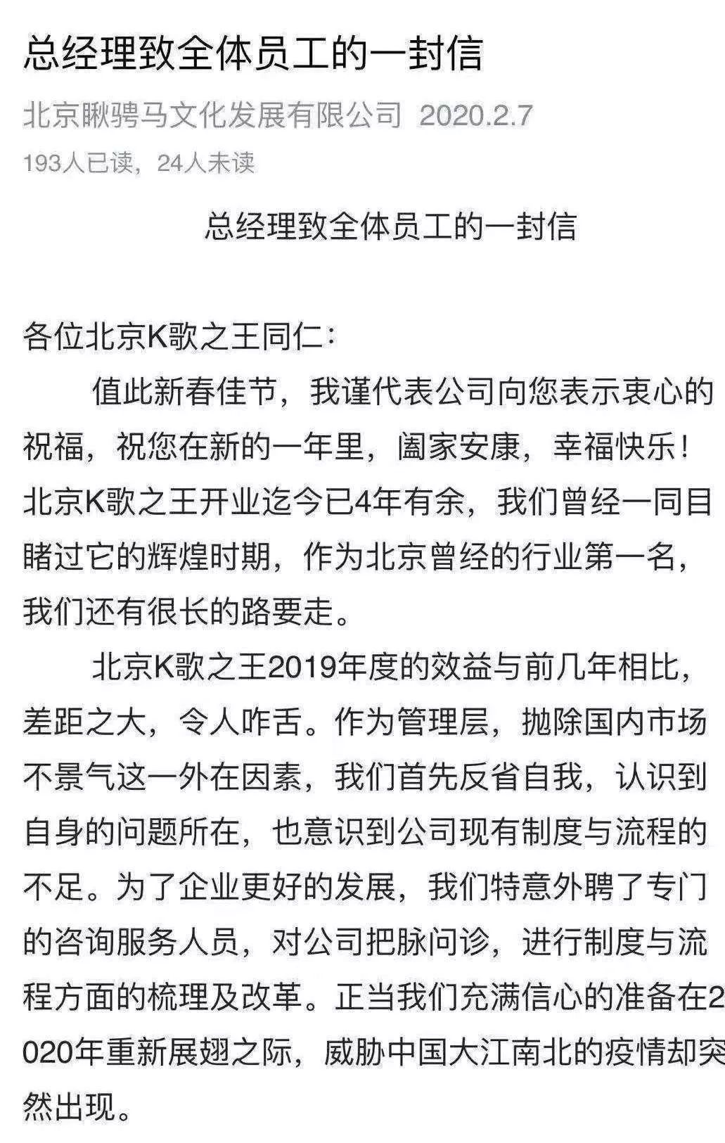 2月7日,北京知名KTV“K歌之王”发布了《总经理致全体员工的一封信》。信中称:“正当我们充满信心的准备在2020年重新展翅之际,威胁中国大江南北的疫情却突然出现。”
