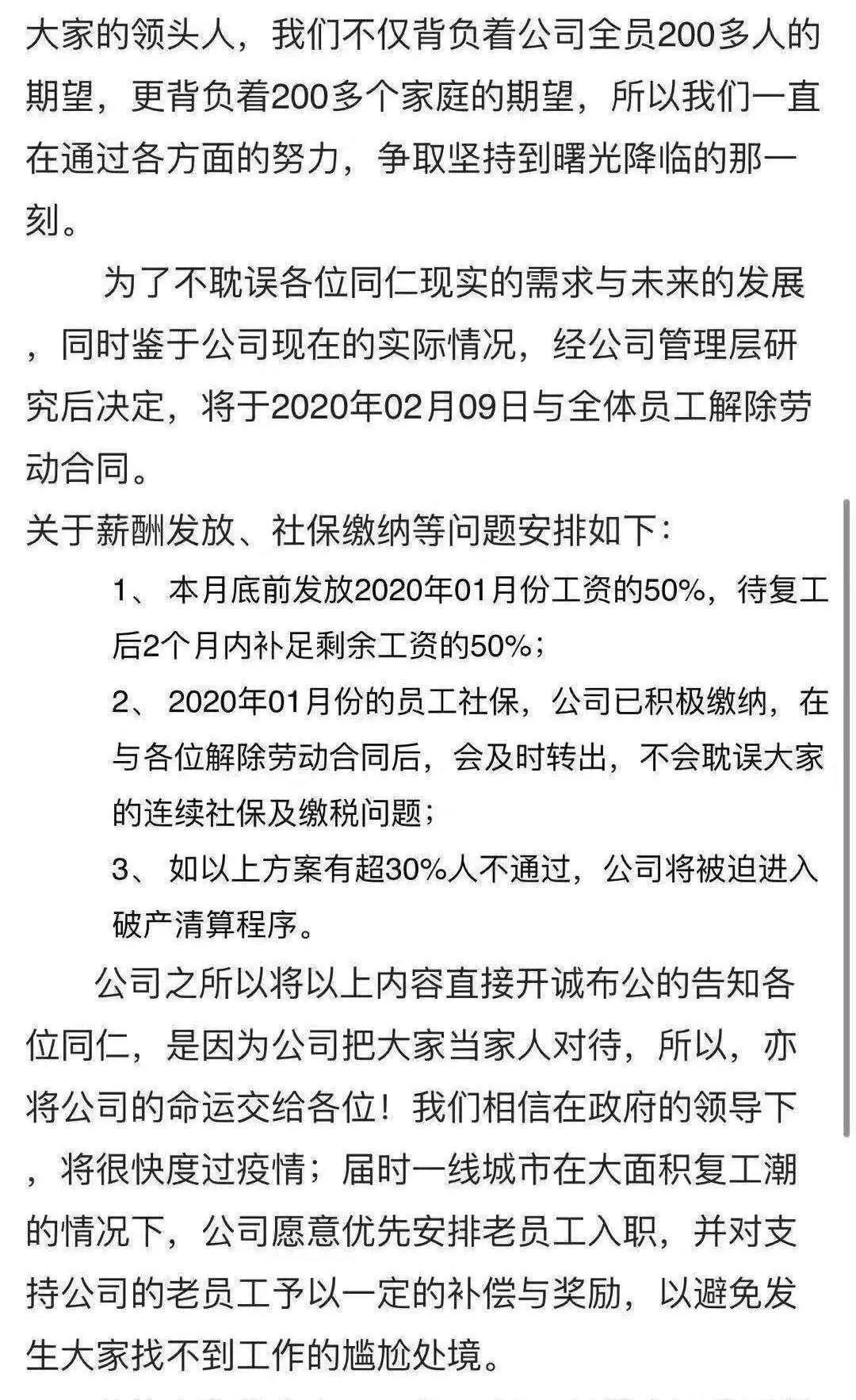 受疫情影响,K歌之王宣布将于2月9日(今天),也就是北京市准备正式上班的前一天,与全部员工、200多名员工解除劳动合同,如果有30%员工不同意这个方案,公司将进行破产清算。