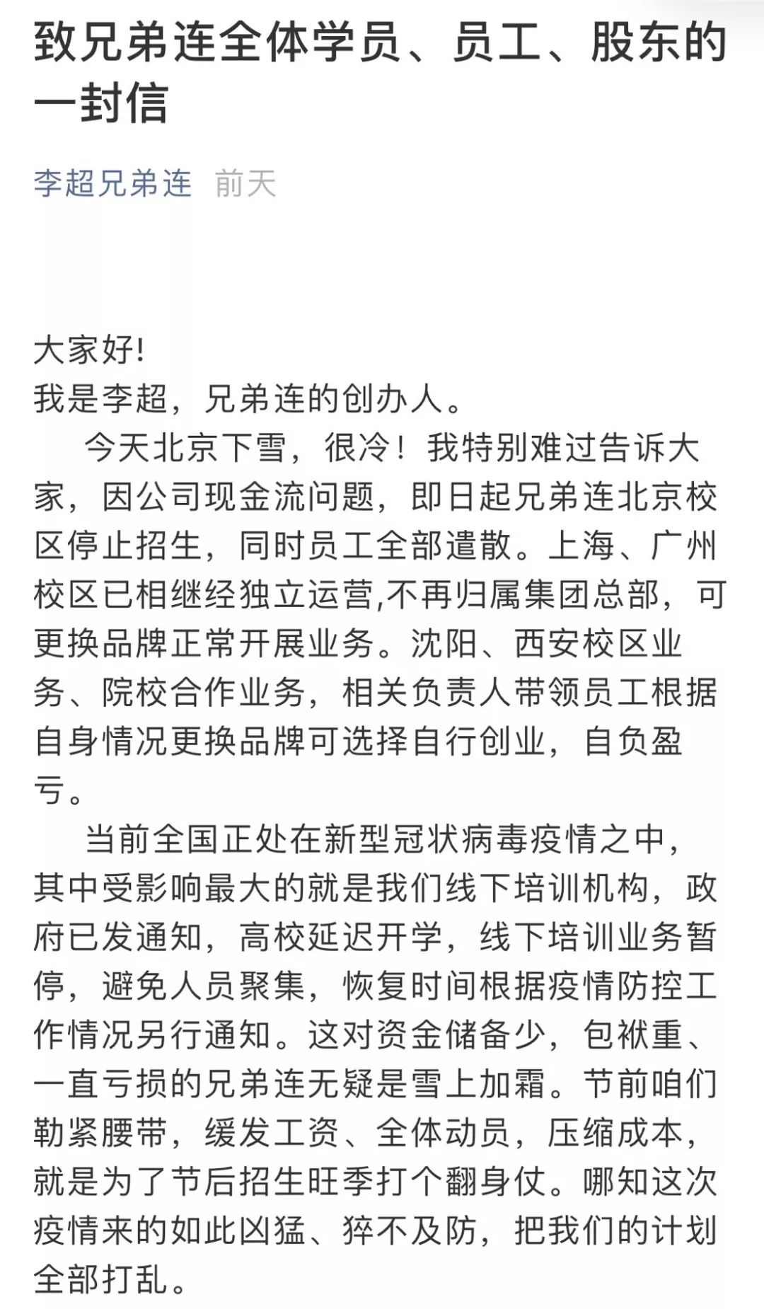 2月6日晚间,知名IT培训机构「兄弟连教育」创始人李超,在其微信公众号中发表《致兄弟连全体学员、员工、股东的一封信》,表示因受疫情影响,即日起,兄弟连北京校区停止招生,员工全部遣散。消息一出,立马刷屏了,兄弟连教育早期是做PHP培训,成立于2006年。专注于IT技术培训,是国内早及大的PHP/LAMP技术专业培训学校。2015年,兄弟连获得华图1.25亿战略投资;2016年11月挂牌新三板,2018年4月25日终止挂牌。