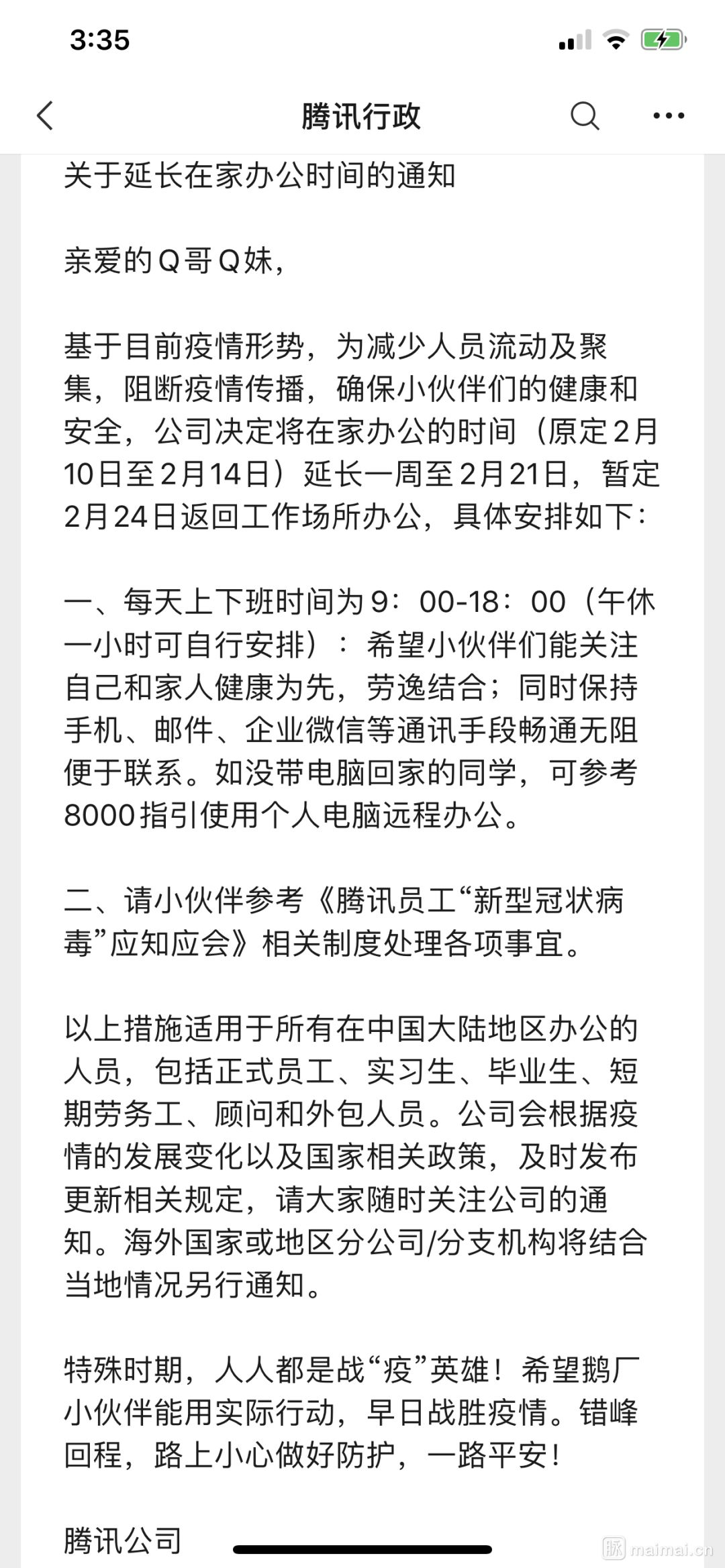 腾讯:2月9日(今天),腾讯再发通知,员工延长至2.24日返回工作场所地办公。